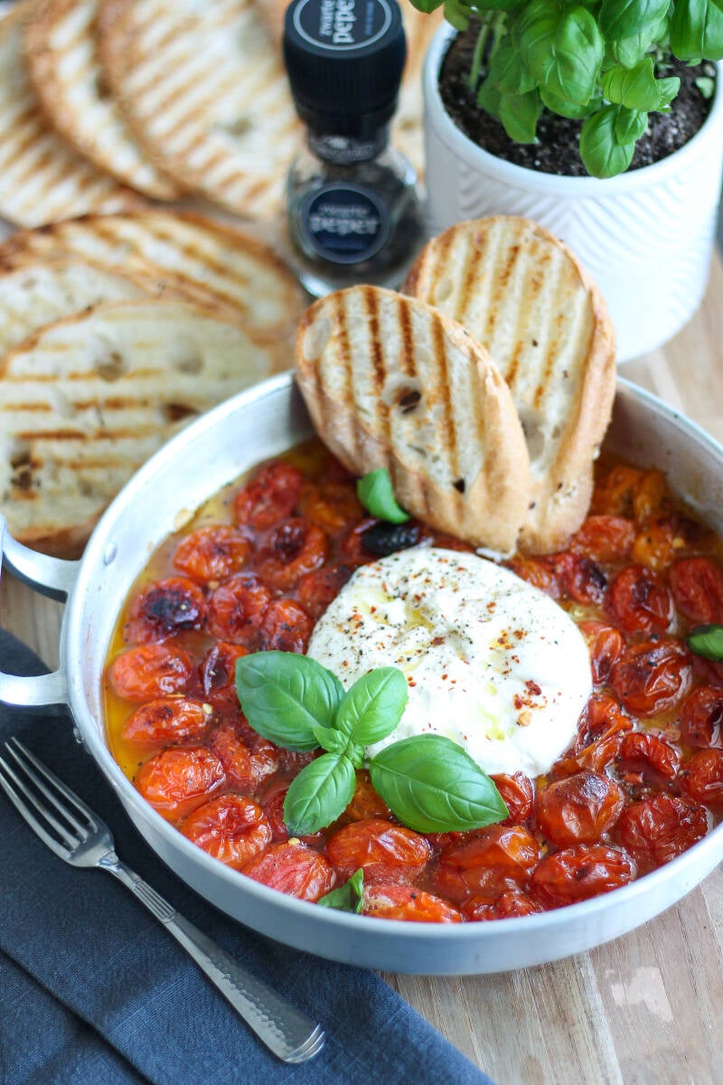 Door de tomaatjes te grillen komt de zoete kant naar boven terwijl je toch het zuurtje behoud. Dat in combinatie met de romige burrata en het kruidige van de basilicum...yum!