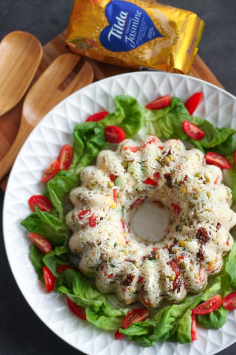 Ik gebruikte hiervoor de Fragrant Jasmine Rice van Tilda. Een slanke korrel met een heerlijk aroma en licht kleverig. Een perfecte soort voor de bereiding van dit recept. Want je kunt de salade natuurlijk gewoon opdienen in een mooie schaal, maar als je echt een stapje verder wilt gaan, kun je het op deze manier serveren. Dan komt het goed uit dat de rijst in vorm blijft.