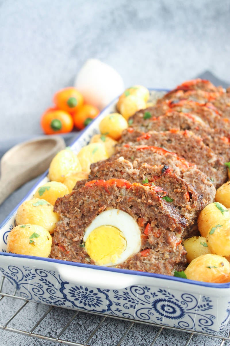 - Wanneer de meatloaf klaar is en mooi gebruind laat je het even afkoelen. Snij het daarna met een gekarteld mes in plakken. Doe dit heel voorzichtig zodat het gekookte ei aan de binnenzijde mooi heel blijft.