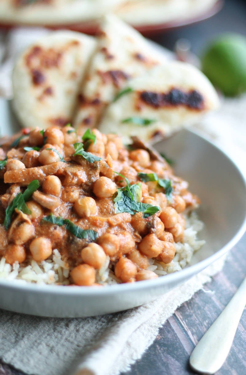 Deze vegetarische curry bestaat uit kikkererwten en champignons. Doordat het zo lekker gekruid is mis je ook geen vlees of vis.