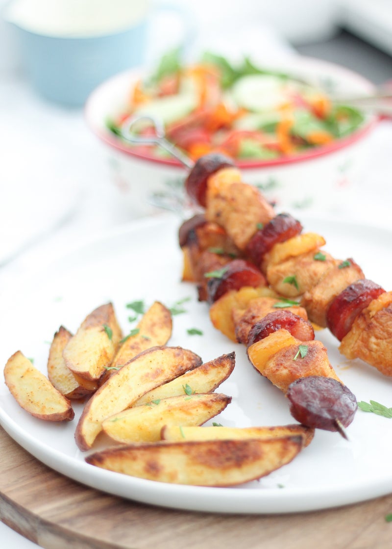 - Pak er 6 grote vleespennen bij (Ik heb de metalen versie gebruikt) en rijg om en om de kip, de chorizo, en de ananas aan de spies.