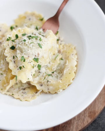 Als liefhebber is het ultiem genieten van dit recept want niet alleen de ravioli is gevuld met ricotta en truffel, maar ook de roomsaus is rijkelijk voorzien.