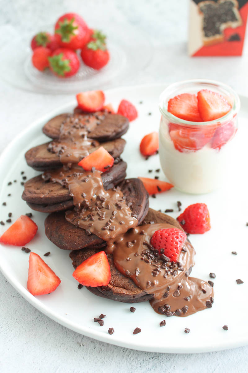 Ontbijten met heerlijke chocolade pancakes....