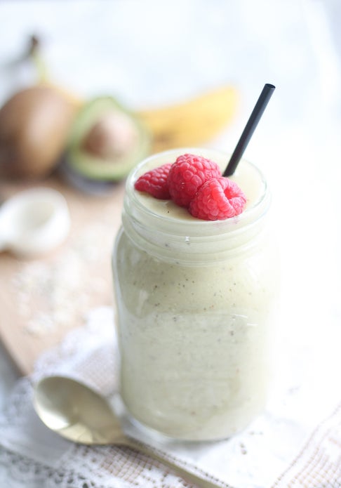 - Schenk de smoothie in een groot glas en maak het af met de frambozen.