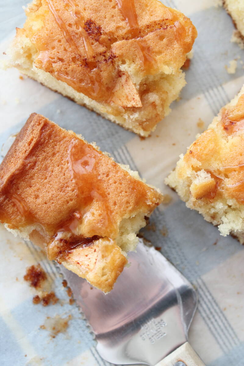 Ik wist dat ik een soort plaatcake wilde maken, maar dan wel luchtig. Er moest een combinatie komen van appel, kaneel en salted caramel. Zodoende kwam ik uit op dit recept.