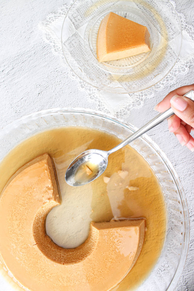 Net voor gebruik draai je de flan op een diep bord om. Controleer van te voren of de randjes goed los zijn van de vorm zodat het geheel er mooi uit komt.